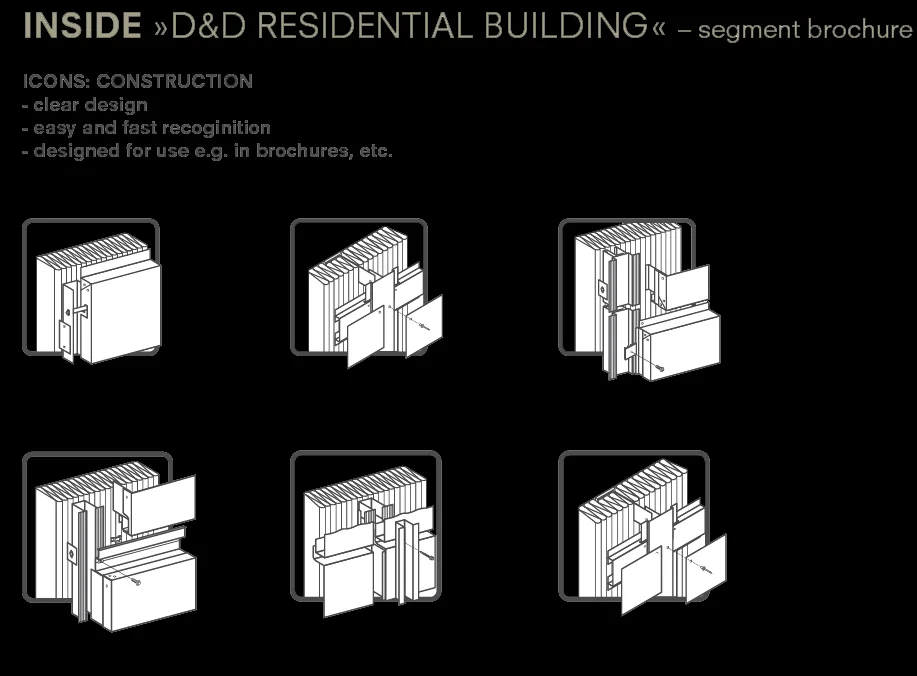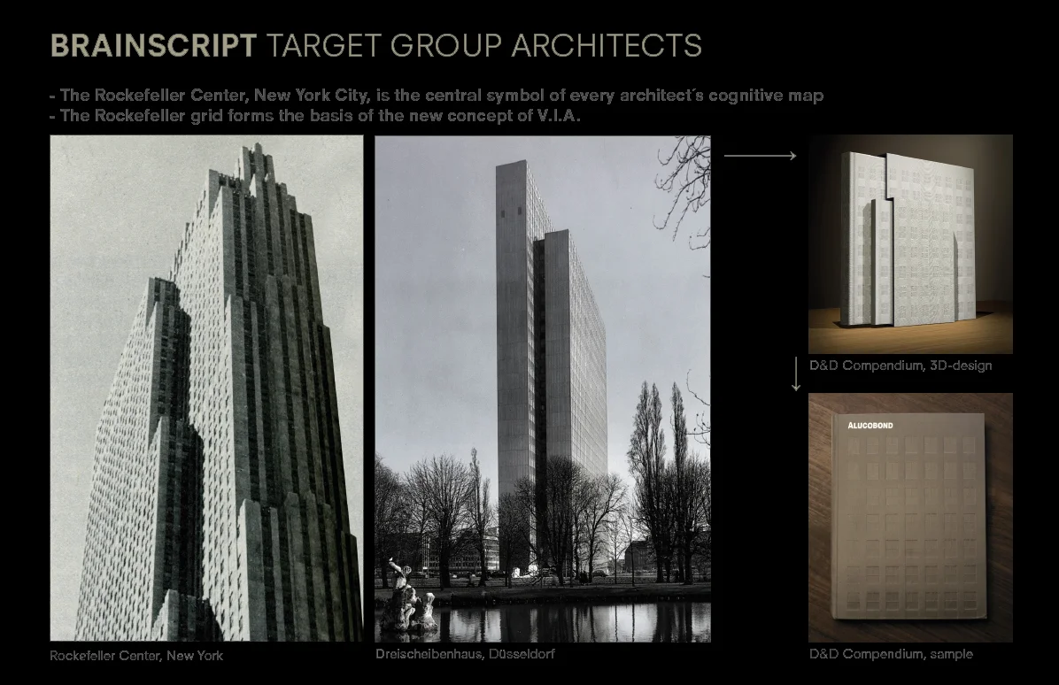 Entwickelt werden sollte ein visueller Auftritt der die Zielgruppe der Architekten und der Immobilienwirtschaft emotionaler anspricht. Es wurde ein Designcode gewählt, der entsprechend der bevorzugten und positiv konnotierten Wahrnehmung der Architekten auf die Gestaltungsprinzipien des Bauhaus zurückgreift. Dunkelgrauer Hintergrund, klares Layout, ruhige Bildkompositionen, sowie, als Gestaltungsgrid, das Fassadenbild des Rockefeller Centers NY. (siehe auch Messedesign BAU 2011 Alucobond)